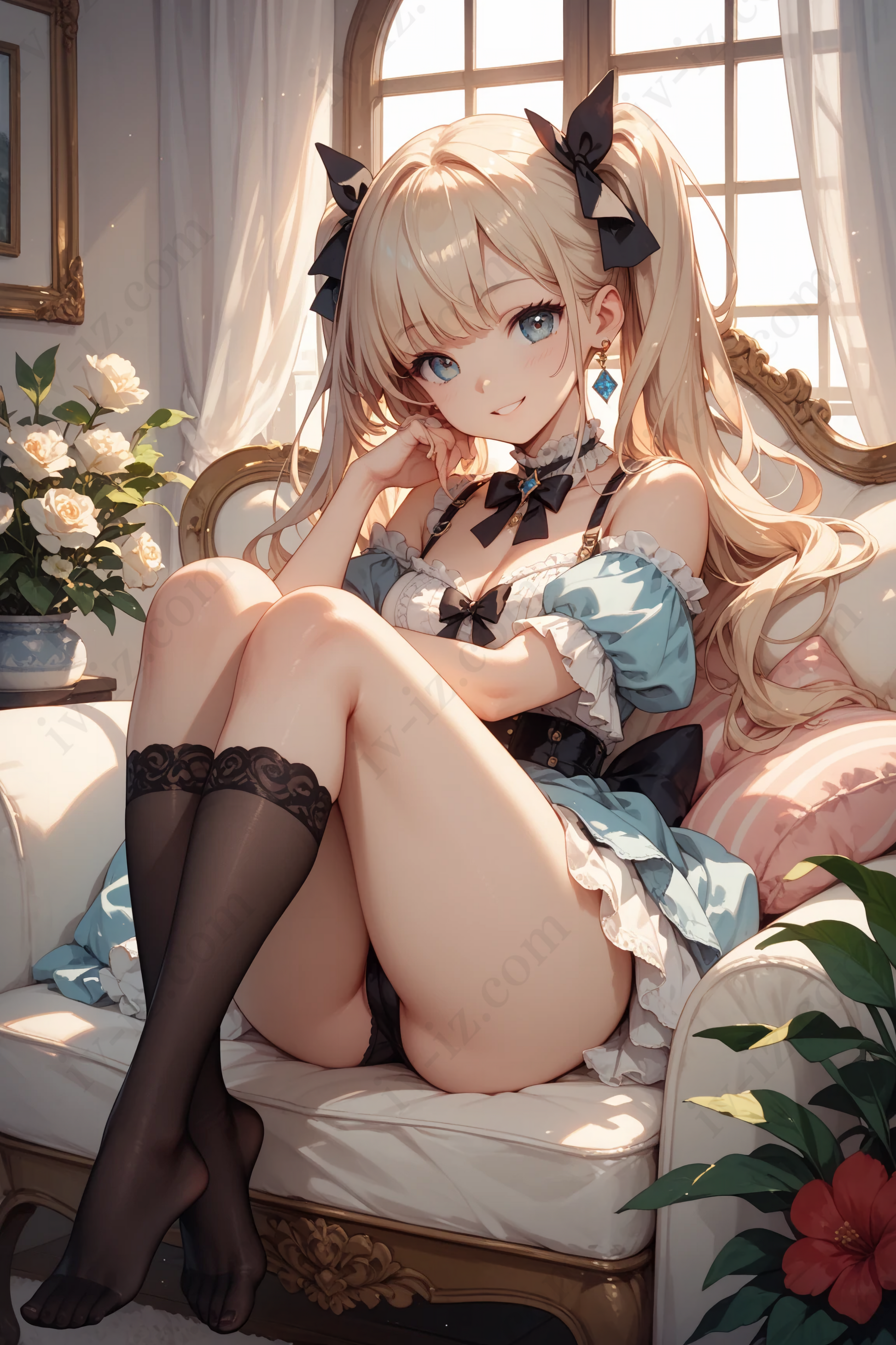 Cute Blonde Anime Girl in Blue Frilled